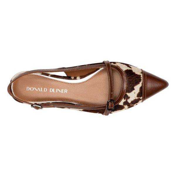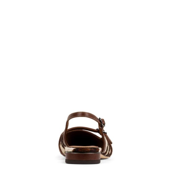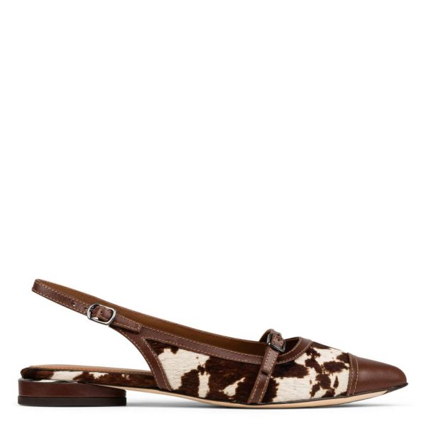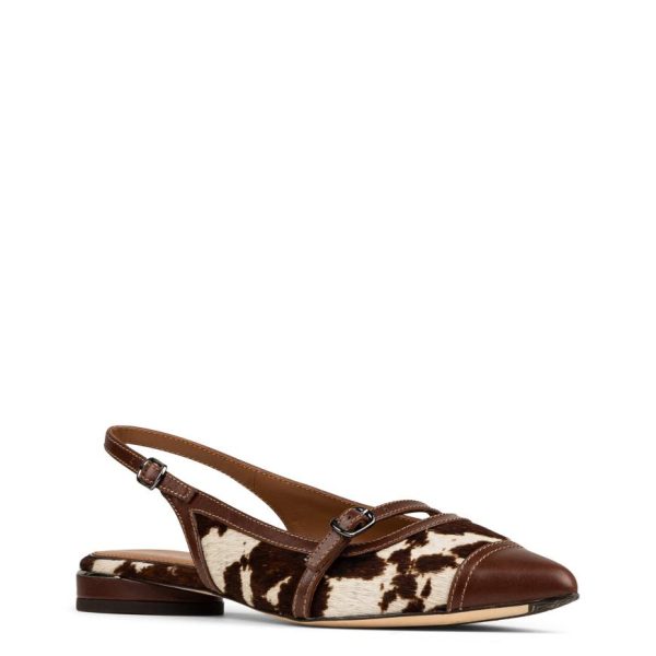 Look no further than the ROZAMAY slingback flat, featuring a sleek pointed cap toe and haircalf upper with matching leather trim. The upper strap and slingback strap, both with adjustable buckle closures, ensure a secure fit. A low barrel-shaped heel with rubber insert provides added comfort and stability, while the buffed leather and rubber outsole offers non-slip traction.