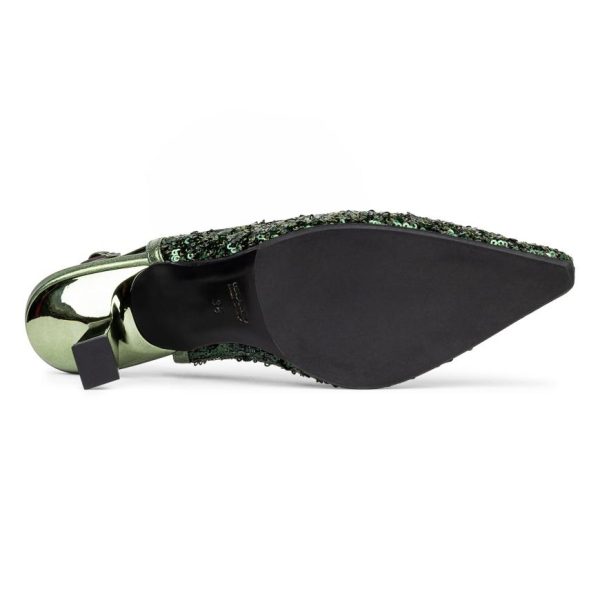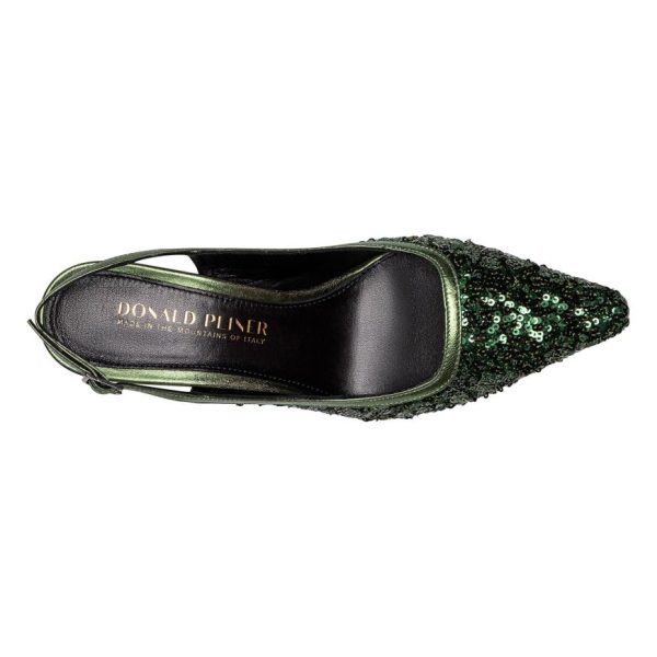 Step out in style with the STESSIA slingback heel in sequin embroidered fabric with soft metallic nappa leather trim. Its sculpted heel gives you the perfect amount of height yet keeps you comfortable on your feet. A memory foam padded insole and leather outsole add to the ease of this stylish shoe. Finished with an adjustable buckle closure. Made in Italy.