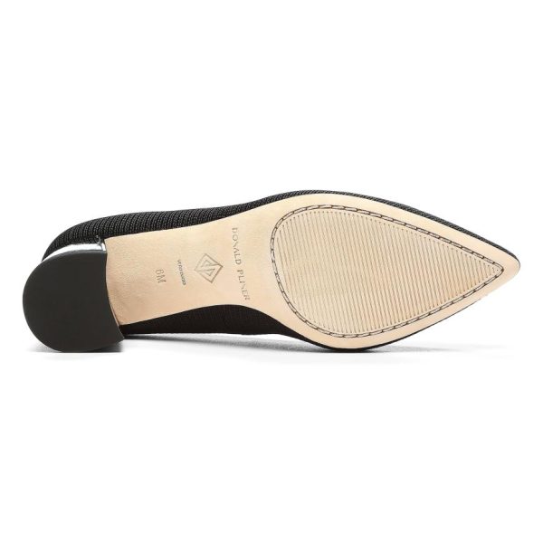 The SUZETTE pump in textured stretch fabric looks sleek and polished with its pointed-toe silhouette. A patent block heel featuring electroplated detail adds bold personality as well as stability to the design. Comfortably lined in nappa with extra padded memory foam on the insole, this contemporary heel is versatile enough to pair with everything yet also makes a statement.
